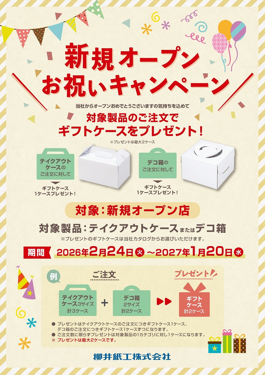 対象製品をご購入頂くと「テイクアウトケース」「デコ箱」どちらかを1ケースプレゼントさせて頂く!という内容です。